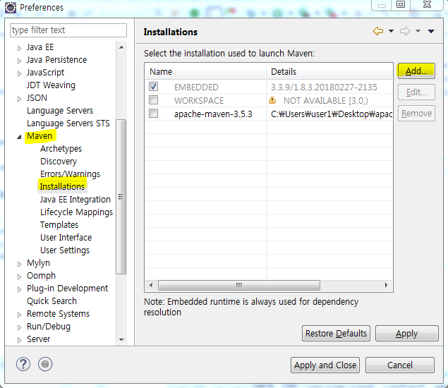 9. 이클립스 -> Preferences -> Maven -> Installations -> Add