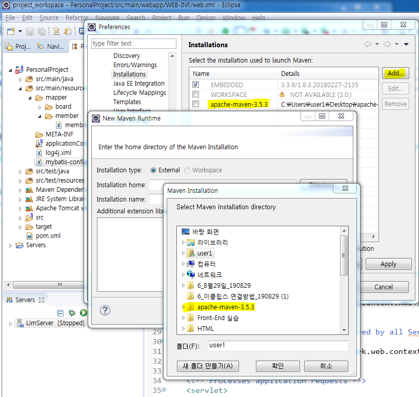 10. 이클립스 ->window-> Preferences -> Maven -> Installations -> Add -> apache-maven