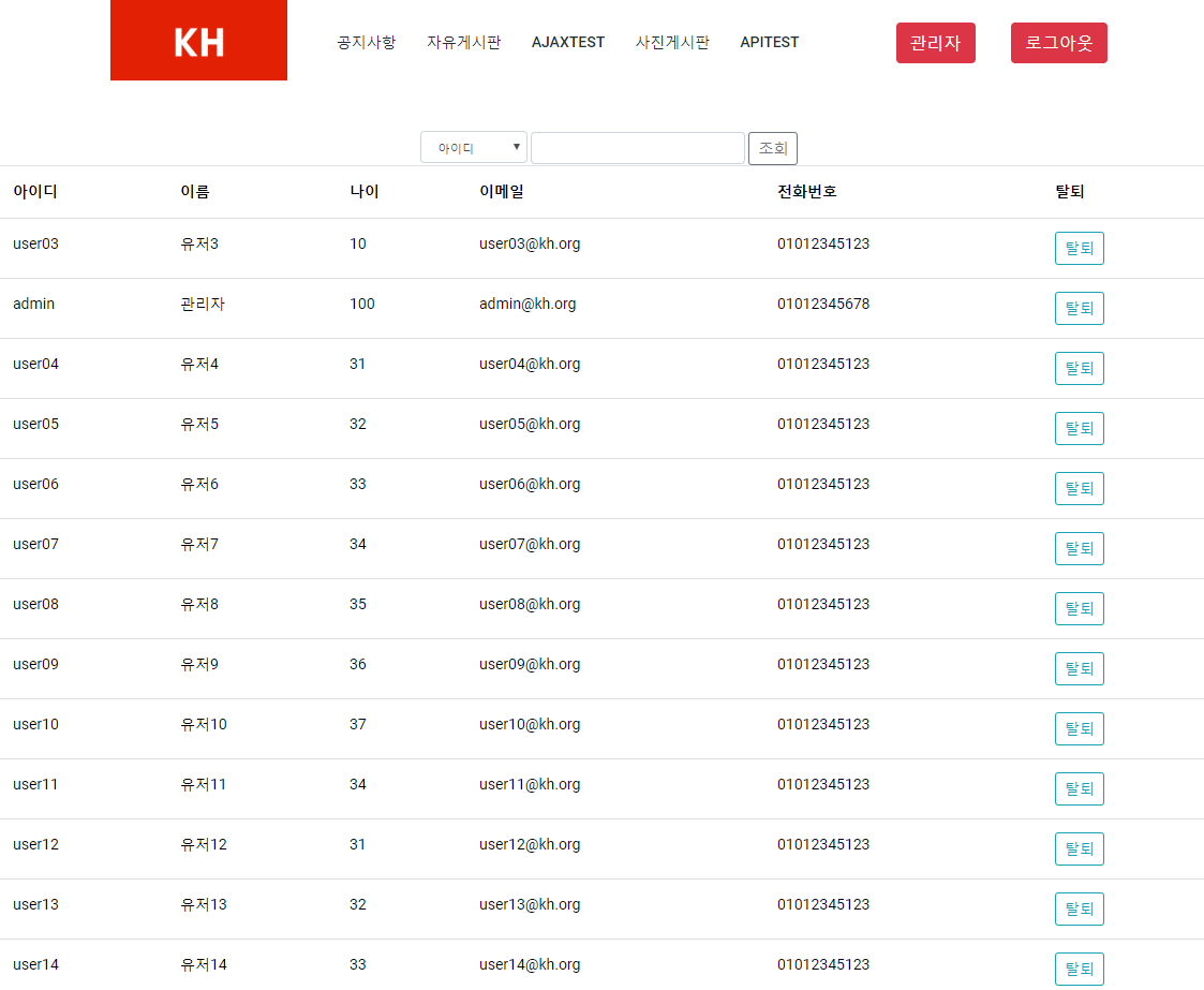<th>이메일</th><th>전화번호</th><th>탈퇴</th>